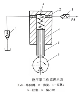 增大,形成局部真空,油箱中的油液在大氣壓的作用下,頂開單向閥1進(jìn)入a中,實(shí)現(xiàn)吸油。當(dāng)偏心向上轉(zhuǎn)時(shí),推動(dòng)柱塞向上移動(dòng),容積a逐漸減小,油液受擠壓而產(chǎn)生壓力,使單向閥1關(guān)閉,油液頂開單向閥3而輸入系統(tǒng),實(shí)現(xiàn)壓油。這樣液壓泵就將原動(dòng)機(jī)輸入的機(jī)械能轉(zhuǎn)換為液體的壓力能。偏心輪連續(xù)轉(zhuǎn)動(dòng),液壓泵不斷地吸油和壓油,也就不斷地向系統(tǒng)供油。由上可知,液壓泵是通過密閉容積作周期性的變化來完成吸油和排油工作的,其輸出油量的多少取決于柱塞往復(fù)運(yùn)動(dòng)的次數(shù)和密封容積變化的大小。這種依靠密封工作容積的變化,將機(jī)械能轉(zhuǎn)換為壓力能的泵,稱為容積式液壓泵。