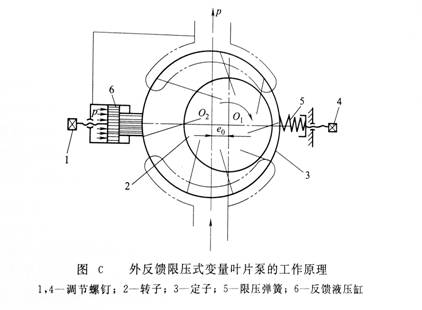 如圖C所示為外反饋限壓式變量葉片泵的工作原理。它是利用排油壓力的反饋?zhàn)饔脕?lái)實(shí)現(xiàn)流量自動(dòng)調(diào)節(jié)的。轉(zhuǎn)子2的中心O1是固定的,定子3可以左右移動(dòng),在限壓彈簧5的作用下,定子被推向左側(cè),使定子中心O2和轉(zhuǎn)子中心O1之間有一初始偏心距e0,它決定了泵的最大流量(e0的大小可由螺釘1調(diào)節(jié))。設(shè)活塞的有效面積為A,泵的壓力為p,則活塞對(duì)定子施向右側(cè)的反饋力為pA。當(dāng)pA<F0(彈簧預(yù)壓縮力)時(shí),定子不動(dòng),仍保持最大的偏心距e0,液壓泵的流量也保持最大值;當(dāng)泵的壓力升高到某一值pB時(shí),使pBA=F0,pB稱(chēng)為泵的限定壓力(pB可通過(guò)調(diào)節(jié)螺釘4設(shè)定),這也是泵保持最大流量的最高壓力;當(dāng)泵的壓力升高到pA>F0時(shí),反饋力克服彈簧力把定子推向右側(cè),偏心距減小,泵的流量也隨之減小。壓力越高,偏心距越小,泵的流量也越小。當(dāng)泵的壓力達(dá)到某一值時(shí),反饋力把彈簧壓縮到最短,定子移動(dòng)到最右端位置,偏心距減到最小,泵的實(shí)際輸出流量為零,泵的壓力便不再升高。