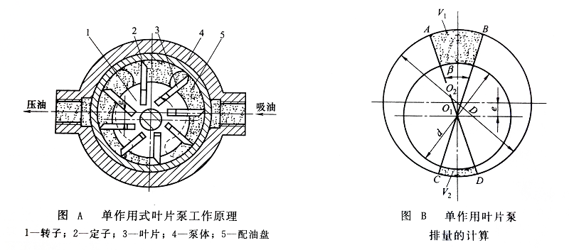 如圖B所示,單作用式葉片泵的轉(zhuǎn)子每轉(zhuǎn)一周時(shí),每?jī)上噜徣~片間的密封容積變化量為V1-V2 。若近似把AB和CD看作是中心為O1的圓弧,設(shè)定子內(nèi)徑為D,則這兩弧的半徑分別為(D/2+e)和(D/2-e)。設(shè)轉(zhuǎn)子的直徑為d,葉片寬度為b,葉片數(shù)為z,兩相鄰葉片的夾角為β0則有