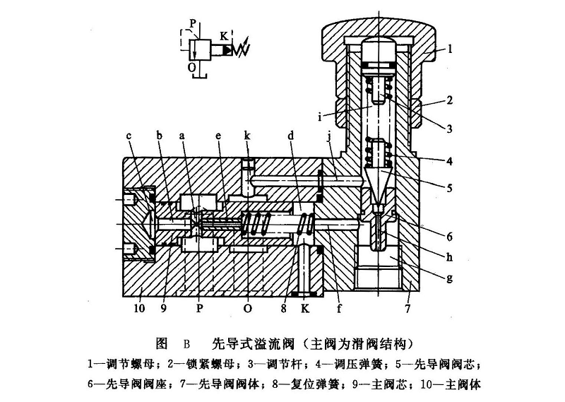 當(dāng)入口油壓升高,使作用于先導(dǎo)閥閥芯5上的液壓力大于先導(dǎo)閥彈簧4的預(yù)緊力時(shí),閥芯5上移,壓縮彈簧4將先導(dǎo)閥口打開(經(jīng)過一段振蕩過程后停在某一平衡位置上),壓力油便經(jīng)阻尼孔e、孔f、g腔、孔h、j、k流入回油腔。由于油液流經(jīng)阻尼孔e后要產(chǎn)生壓力降,所以主閥芯9右端的油壓力小于左端的油壓力,當(dāng)這個(gè)壓力差較小、還不足以克服復(fù)位彈簧8的作用力時(shí),閥芯9仍然處在最左端。隨著閥入口油壓的不斷升高,這個(gè)壓力差也提高。當(dāng)這個(gè)壓力差對(duì)主閥芯9的作用力超過復(fù)位彈簧8的作用力時(shí),主閥芯9向右移動(dòng),溢流口開啟,將閥的進(jìn)油口P和回油口O接通,實(shí)現(xiàn)溢流。此后,溢流閥入口油壓不再升高,其值為與此時(shí)調(diào)壓彈簧4的預(yù)緊力相對(duì)應(yīng)的某一確定值。調(diào)整調(diào)節(jié)螺母1,通過調(diào)節(jié)桿3可以改變調(diào)壓彈簧4的預(yù)緊力大小,從而實(shí)現(xiàn)調(diào)整溢流閥的進(jìn)油壓力的作用。這就是先導(dǎo)式溢流閥的定壓過程。其穩(wěn)壓過程與直動(dòng)式溢流閥相同,故不贅述。其職能符號(hào)見圖B。