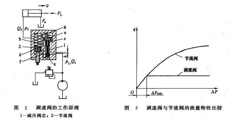 調(diào)速閥與節(jié)流閥的流量特性比較如圖F所示。由圖中曲線可以看出,節(jié)流閥的流量隨其進(jìn)出口壓差的變化而變化;調(diào)速閥在其進(jìn)出口壓差大于一定值后,流量基本不變。但在調(diào)速閥進(jìn)出口壓差很小時(shí),較小的壓差不能使調(diào)速閥中的減壓閥芯抬起,減壓閥芯在彈簧力的作用下處在最下端,減壓口全部打開,不起減壓作用,整個(gè)調(diào)速閥相當(dāng)于節(jié)流閥的結(jié)果,此時(shí)流量特性與節(jié)流閥相同(曲線重合部分)。所以要保證調(diào)速閥正常工作,應(yīng)使其進(jìn)出口最小壓差△pmin >0.5MPa。