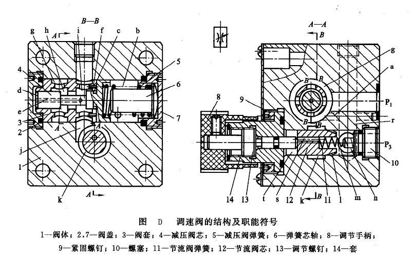 圖D所示為調(diào)速閥的結(jié)構(gòu)及職能符號(hào)。調(diào)速閥是由一減壓閥和一普通節(jié)流閥串聯(lián)而成的組合閥。