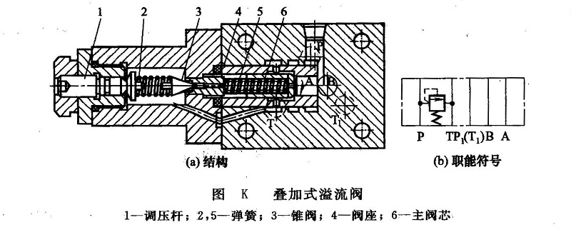 如圖K所示的先導(dǎo)型疊加式溢流閥,由主閥和先導(dǎo)閥兩部分組成。主閥芯為二級(jí)同心式結(jié)構(gòu),先導(dǎo)閥為錐閥式結(jié)構(gòu)。其工作原理與一般的先導(dǎo)式溢流閥相同。圖中油口P和T除分別與溢流閥的進(jìn)油口和回油口相通外,還與上、下元件相應(yīng)的油口相通。A、B、T1油口則是溝通上、下元件相對(duì)應(yīng)的油口而設(shè)置的。