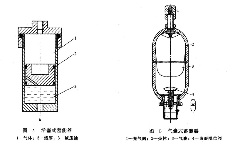 (1)活塞式蓄能器 圖A所示為活塞式蓄能器結(jié)構(gòu)。活塞的上部為壓縮氣體,下部為壓力油液,壓力油從下部進(jìn)油口a進(jìn)入,推動(dòng)活塞,壓縮活塞上腔的氣體儲存能量;當(dāng)系統(tǒng) 壓力低于蓄能器內(nèi)壓力時(shí),氣體推動(dòng)活塞,釋放壓力油,滿足系統(tǒng)需要。