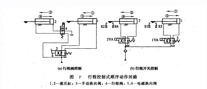 行程控制式是利用液壓缸移動到某一規(guī)定位置后,發(fā)出控制信號,使下一個液壓缸動作的控制方式。這種控制方式應(yīng)用非常普遍,它可由行程閥、電氣行程開關(guān)或特殊結(jié)構(gòu)的液壓缸等實(shí)現(xiàn)。