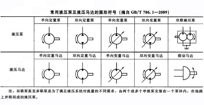采用GB/T 786. 1-2009繪制的常用液壓泵及液壓馬達(dá)圖形符號(hào)見下表,圖形符號(hào)意義如下。