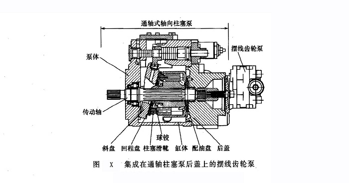 針齒環(huán)旋轉(zhuǎn)的擺線齒輪泵以體積小、價(jià)廉和自吸能力強(qiáng)的優(yōu)點(diǎn),除了用作某些輕載機(jī)床液壓系統(tǒng)的主泵外,特別廣泛地被集成在通軸柱塞泵的后蓋上(圖X),作為低壓補(bǔ)油泵或控制油源使用。此種泵一般可實(shí)現(xiàn)單向供油而與輸入轉(zhuǎn)向無關(guān),這一性能對(duì)于某些車輛或行走機(jī)械上需要用車輪驅(qū)動(dòng)的應(yīng)急轉(zhuǎn)向、制動(dòng)系統(tǒng)具有特殊的使用意義。