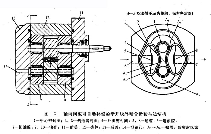 ②軸向間隙可自動補償?shù)臐u開線外嚙合齒輪馬達 圖G所示為軸向間隙可自動補償?shù)臐u開線外嚙合齒輪馬達結(jié)構(gòu)。在軸套9、10的外端布有密封圈1~4,中心密封圈1包圍兩個軸承孔,形成一個中間收縮的“8”字形區(qū)域A1,因區(qū)域A1通過兩個軸承與泄油孔14相通,故區(qū)域A1內(nèi)的壓力與泄漏油腔的壓相等。側(cè)邊密封圈2和3對稱布置在密封圈1的兩側(cè)(密封圈2和3各有一段長度直接與密封圈1接觸),分別形成菱形區(qū)域A2和A3,A2經(jīng)通道5與進油腔6相通,A3經(jīng)通道8與回油腔7相通。外圍密封圈4也布置成菱形,包圍著密封圈1、2和3(密封圈4上有兩段長度分別與密封圈2和3直接接觸),因密封圈2和3的兩側(cè)都分別與密封圈1和4直接接觸,故在密封圈4的包圍圈內(nèi)又形成兩個區(qū)域A4和A5,由于滲漏和串油的原因,所以A4和A5內(nèi)的壓力很接近于高壓腔壓力。密封圈4夾在殼體12與前蓋11(后蓋13)之間,密封圈1夾在軸套和前蓋(后蓋)之間,而密封圈2和3與密封圈4相接近的部分保持在殼體和前蓋(后蓋)之間。所有密封圈都嵌在前蓋(后蓋)的凹槽中。各密封圈之間互相接近的部分,用直接接觸的辦法,可以簡化加工和裝配工藝,降低成本。