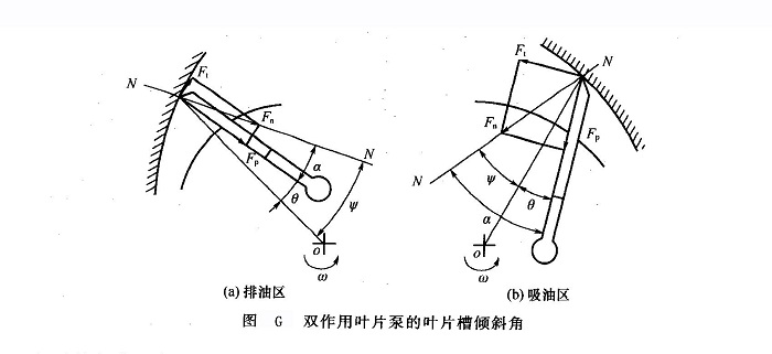 e.葉片前傾安放 當(dāng)葉片在壓油區(qū)沿定子曲線滑動(dòng)時(shí),定子內(nèi)表面對(duì)葉片的法向接觸反力Fn可分解為沿葉片槽方向的分力Fp和橫向分力Ft,由于葉片的外伸部分是懸臂梁結(jié)構(gòu),故橫向分力會(huì)在葉片與槽側(cè)壁的接觸處產(chǎn)生較大的摩擦力,葉片與定子曲線的接觸壓力角α(定子曲線接觸點(diǎn)處的法線方向與葉片方向的夾角)越小,橫向分力Ft=Fnsinα越小,越有利于葉片在其槽內(nèi)自如滑動(dòng),并減小摩擦力從而減少葉片與槽之間的磨損。故葉片槽不徑向開設(shè),而是順轉(zhuǎn)向前傾一個(gè)角度θ(通常θ=10°~14°)開設(shè),使α<φ,即α=φ-θ[圖G(a)]。否則,壓力角a=φ將較大,Ft也較大。但這樣做的結(jié)論并不適用于吸油區(qū)[圖G(b)],一方面在吸油區(qū)葉片槽前傾反而使壓力角α增大,變?yōu)棣?span lang="EN-US">=φ+θ,使葉片的受力情況更加惡化;另一方面葉片沿定子曲線滑動(dòng)時(shí),其頂部實(shí)際上除了受到定子內(nèi)表面反作用力外,還受到與滑動(dòng)方向相反的摩擦力Ff作用,兩者的合力F才是計(jì)算有害橫向分力Ft的依據(jù),故上述僅以法向接觸反力Fn作為依據(jù)勢(shì)必得出壓力角越小越好的錯(cuò)誤結(jié)論。新的觀點(diǎn)認(rèn)為取θ=0°更為合理,目前國(guó)外一些雙作用葉片泵的葉片槽是徑向開設(shè)的,所以關(guān)于葉片安放角問題仍值得進(jìn)行深入探討。