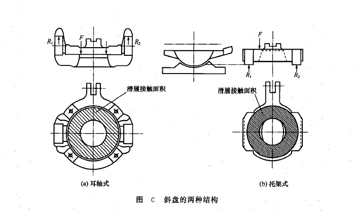 斜盤(pán)的外形尺寸和支承形式直接影響變量泵的外廓尺寸和重量大小。斜盤(pán)的常見(jiàn)結(jié)構(gòu)有耳軸式和托架式兩種典型結(jié)構(gòu):前者[圖C(a)]的耳軸處支點(diǎn)的反力R1距離柱塞組件的合力F的作用點(diǎn)較遠(yuǎn),為了具有足夠的剛度和強(qiáng)度,不得不加大斜盤(pán)尺寸,故斜盤(pán)擺動(dòng)時(shí)占據(jù)空間增大;后者[圖C(b)]的支點(diǎn)反力R1與柱塞組件的合力F的距離可設(shè)計(jì)為很近,斜盤(pán)剛度問(wèn)題基本不存在了,同時(shí)外形也減小了,故擺動(dòng)時(shí)占據(jù)空間減小,大大減輕了泵的重量。