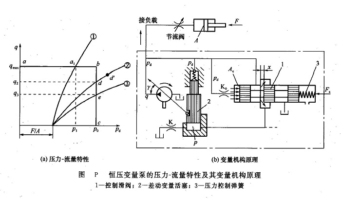 b.恒壓控制變量 恒壓變量泵中的恒壓變量機(jī)構(gòu)是通過泵出口壓力與變量機(jī)構(gòu)壓力調(diào)定值之間的差值來調(diào)節(jié)泵的輸出流量,使泵保持出口壓力為定值。此泵在系統(tǒng)壓力未達(dá)到調(diào)定值之前為定量泵,向系統(tǒng)提供泵的最大流量;當(dāng)系統(tǒng)壓力達(dá)到調(diào)定值后,不論輸出流量如何變化,其輸出壓力恒定,故稱為恒壓變量泵。泵的壓力一流量特性如圖P(a)所示,恒壓變量機(jī)構(gòu)的工作原理如圖P(b)所示。泵出口壓力被引入先導(dǎo)控制滑閥1的左端,形成液壓推力pdAc和右端壓力控制彈簧的作用力Fs相比較。Fs代表了恒壓泵的給定壓力p0,即p0=Fs/Ac。