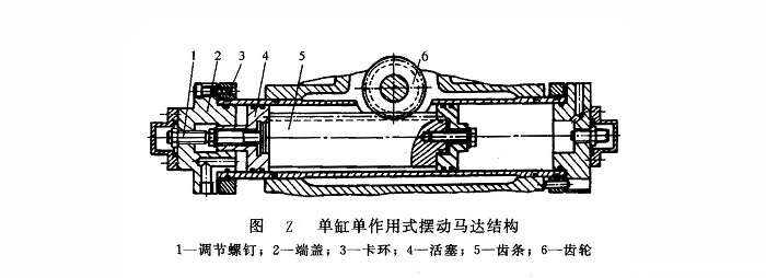 ①單缸單作用式擺動(dòng)馬達(dá)(圖Z) 在單缸單作用式擺動(dòng)馬達(dá)中,作活塞桿用的齒條5和齒輪6嚙合作為機(jī)械轉(zhuǎn)換器。當(dāng)輸入壓力油時(shí),活塞4推動(dòng)齒條作直線移動(dòng),經(jīng)齒輪將直線移動(dòng)轉(zhuǎn)換為旋轉(zhuǎn)運(yùn)動(dòng),由齒輪軸輸出轉(zhuǎn)矩。活塞行程即輸出轉(zhuǎn)角大小的控制可通過(guò)螺釘1調(diào)節(jié)。這種擺動(dòng)馬達(dá)的優(yōu)點(diǎn)是結(jié)構(gòu)簡(jiǎn)單,位置精度便于控制,應(yīng)用廣泛。