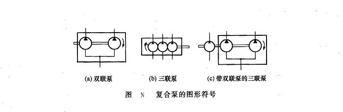 復(fù)合液壓泵的性能參數(shù)(如壓力、排量等)取決于相關(guān)單泵的參數(shù)。但作用于各單泵傳動(dòng)軸和通軸上的最大轉(zhuǎn)矩不得高于它們?cè)试S的極限值,尤其必須考慮到作用于第一級(jí)驅(qū)動(dòng)軸上的總轉(zhuǎn)矩是驅(qū)動(dòng)其他幾級(jí)單泵的轉(zhuǎn)矩之和,如圖M所示。復(fù)合泵的液壓圖形符號(hào)與各泵間的油路連接方式有關(guān),圖N所示為三種復(fù)合泵的液壓圖形符號(hào)。