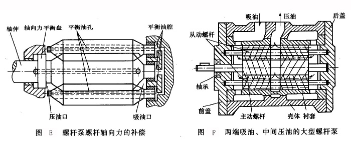 a.軸向力及其平衡在螺桿泵中,工作介質(zhì)的壓力沿軸線逐漸升高,這一壓差對螺桿副產(chǎn)生一個由壓油腔指向吸油腔的軸向推力,它將使螺桿間的摩擦力增大,加劇各配合表面的磨損并降低機(jī)械效率。常用的軸向力平衡措施如下(圖E)。