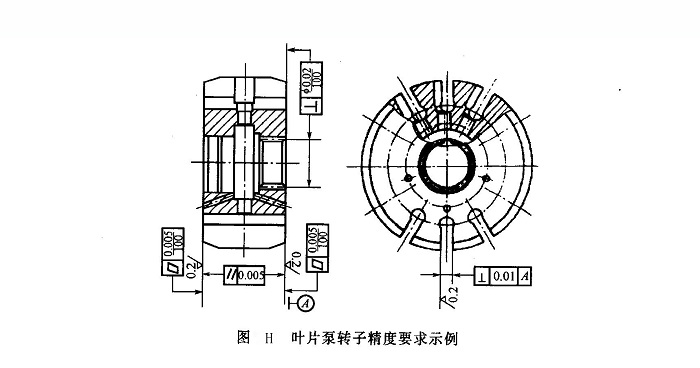轉(zhuǎn)子的精度要求示例如圖H所示。轉(zhuǎn)子的主要加工工藝過(guò)程為:材料正火→粗車(chē)端面和外圓,鉆孔→精車(chē)端面和外圓,擴(kuò)孔,倒角→精車(chē)另一端面,鏜、鉸孔,倒角→拉內(nèi)孔花鍵→粗磨端面(以車(chē)削時(shí)基準(zhǔn)面定位)→鉆、鉸定位孔→鉆、銑、鉸12個(gè)徑向孔→鉆葉片槽底孔→銑葉片槽→去除各處銳棱毛刺→滲碳淬火→振動(dòng)拋光去毛刺→珩鉸柱銷(xiāo)孔→磨內(nèi)孔→精磨兩端面→磨葉片槽→退磁、清洗、防銹→成品檢驗(yàn)→入零件成品庫(kù)。
