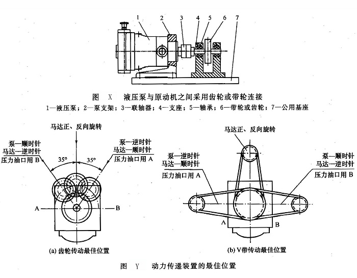 若原動(dòng)機(jī)振動(dòng)較大(如內(nèi)燃機(jī)),則液壓泵與原動(dòng)機(jī)之間建議采用帶輪或齒輪進(jìn)行連接(圖X),應(yīng)加一堆支座來安裝帶輪或齒輪,該支座與泵軸的同軸度誤差應(yīng)不大于Φ0.05mm;泵的安裝支架與原動(dòng)機(jī)的公告基座要有足夠的剛度,以保證運(yùn)轉(zhuǎn)時(shí)始終同軸。齒輪和V帶傳動(dòng)應(yīng)采用圖Y所示的最佳位置。