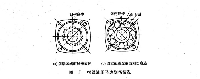 ②原因分析拆檢發(fā)現(xiàn),與馬達(dá)定子、轉(zhuǎn)子端面相接觸的前端蓋端面上和固定配流盤端面上分別有3道七邊形波紋狀的明顯劃傷痕跡。前端蓋端面上的劃傷情況較輕,劃傷深度較淺[圖J(a) ];固定配流盤端面劃傷較重,劃傷深度為0.1~0.2mm、寬度為0.1~0.3mm[圖J(b)],由于前端蓋端面及配流盤端面劃傷后,將使馬達(dá)七個(gè)封閉油腔相互串通,造成馬達(dá)內(nèi)泄漏嚴(yán)重,從而嚴(yán)重影響馬達(dá)輸出轉(zhuǎn)矩,在工作中表現(xiàn)為馬達(dá)工作無力。由于該機(jī)工作條件十分惡劣,作業(yè)對象是水泥砂石,又缺乏必要的防塵措施,使液壓油嚴(yán)重污染,造成馬達(dá)端面運(yùn)動(dòng)副磨損劃傷,這是主要原因。
