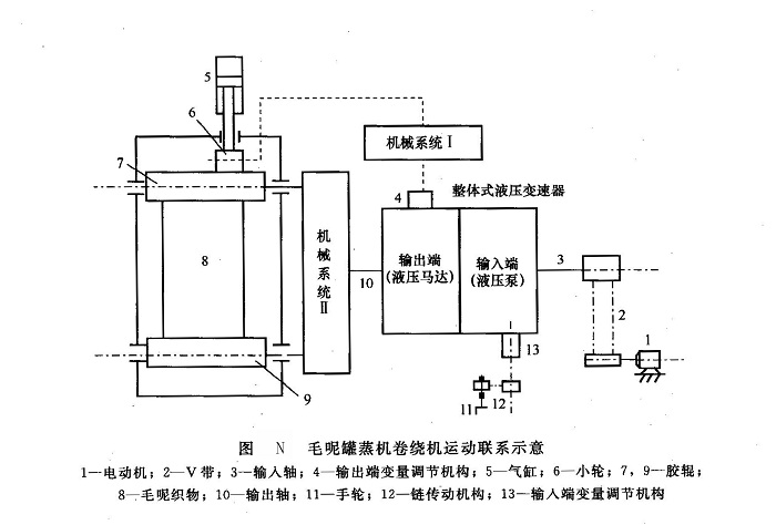 ①功能、結(jié)構(gòu)及故障現(xiàn)象毛呢罐蒸機是從英國Saler公司引進的一種紡織設(shè)備,由卷繞機和罐蒸器兩部分組成,用于毛呢織物的卷繞和罐蒸,以提高產(chǎn)品美觀度:卷繞機由一整體式液壓變速器驅(qū)動和控制(圖N),其主要功能是將經(jīng)剪絨之后卷在膠輥9上的毛呢織物均勻地卷繞到膠輥7上。按卷繞工藝,要求該液壓變速器能通過由齒輪、同歲齒形帶等機構(gòu)零件組成的機械系統(tǒng)Ⅱ正、反向啟動膠輥9及7,且能通過該變速器輸入和輸出端的變量調(diào)節(jié)機構(gòu)使兩個膠輥的轉(zhuǎn)速從0~1500r/min得到無級調(diào)節(jié),同時還能通過起反饋作用的機械系統(tǒng)I與氣缸5及小輪6的配合,使兩個膠輥之間的織物的線速度基本恒定,以保證適當張力,實現(xiàn)均勻卷繞。