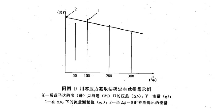 (2)空載排里Vi的計算方法。在若干泵出口或馬達(dá)進(jìn)口的壓力p下,通過測量液壓泵出口或馬達(dá)進(jìn)口的流量q確定液壓泵或液壓馬達(dá)的空載排量(見附圖D)。